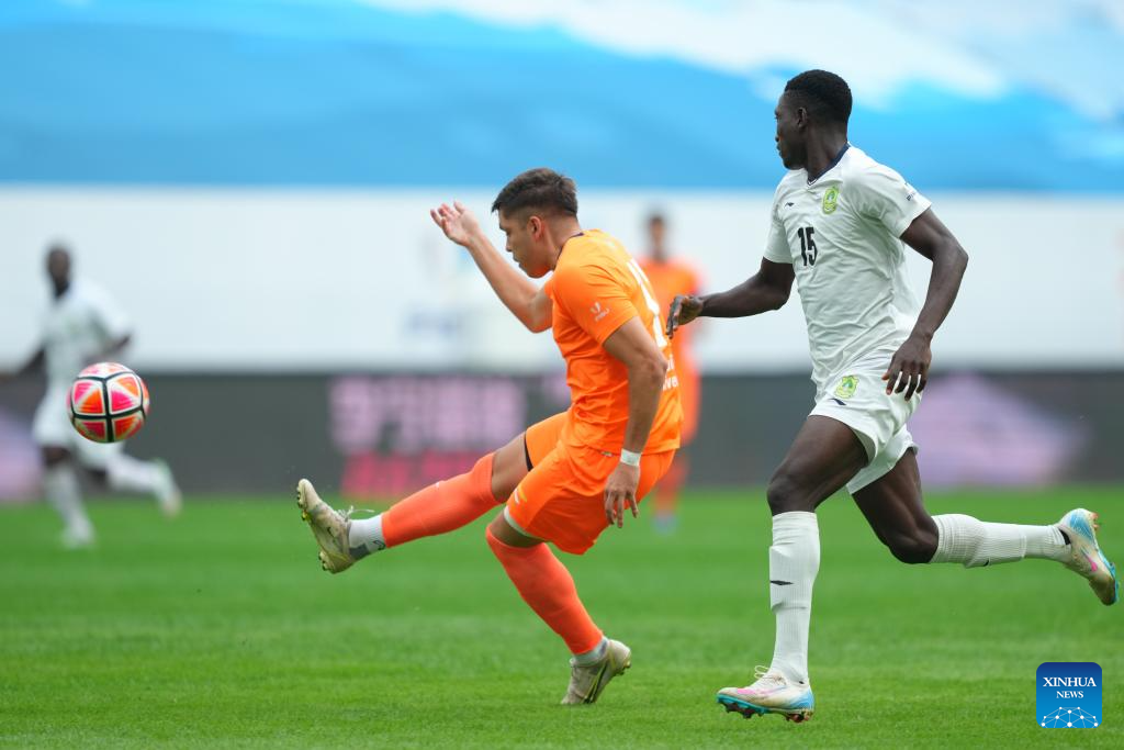 Gabriel Vieira Barbara (front L) of Paulista University shoots to score during the men's final match between Paulista University (Brazil) and University for Development Studies (Ghana) of 2025 FISU University World Cup Football in Dalian, northeast China's Liaoning Province, Sept. 28, 2025. (Xinhua/Zheng Huansong)