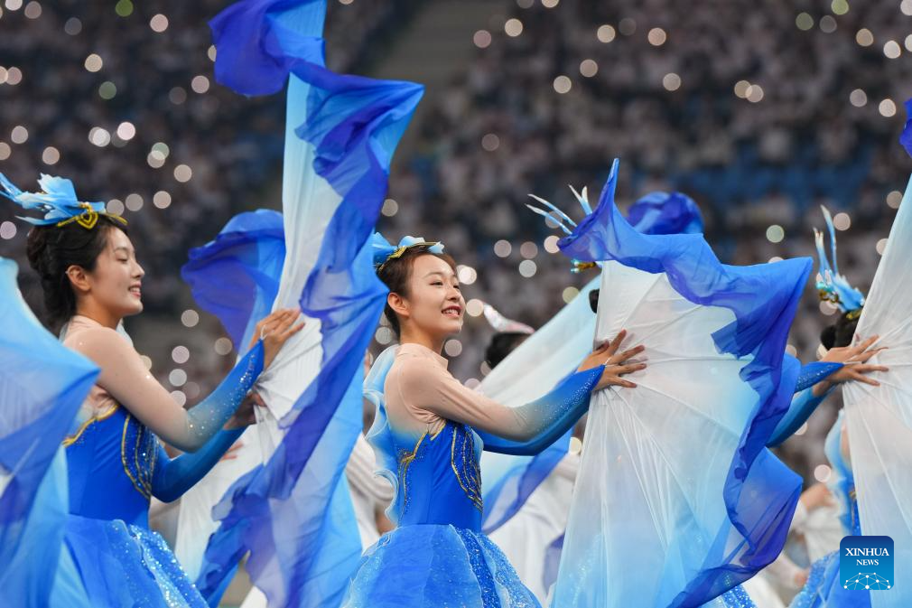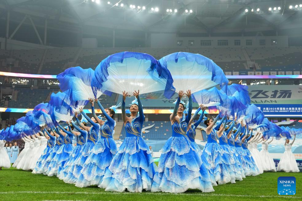 Dancers perform during the closing ceremony for the 2025 FISU University World Cup Football in Dalian, northeast China's Liaoning Province, Sept. 28, 2025. (Xinhua/Zheng Huansong)