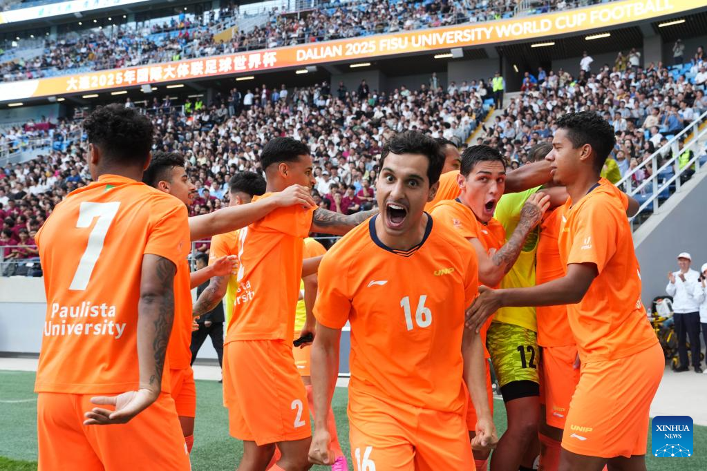 Players of Paulista University celebrate during the men's final match between Paulista University (Brazil) and University for Development Studies (Ghana) of 2025 FISU University World Cup Football in Dalian, northeast China's Liaoning Province, Sept. 28, 2025. (Xinhua/Zheng Huansong)