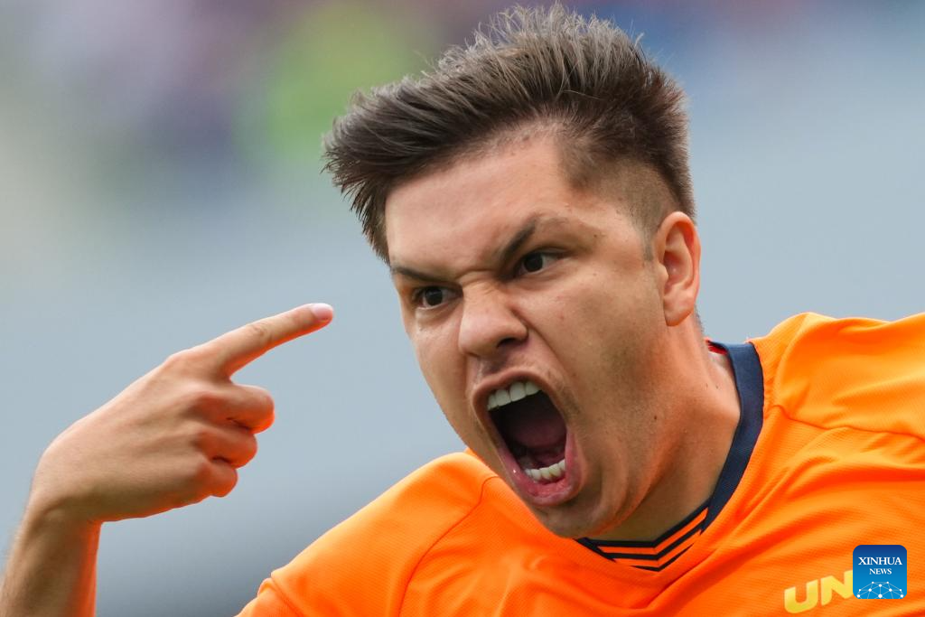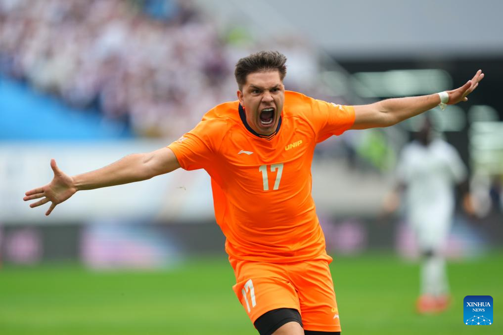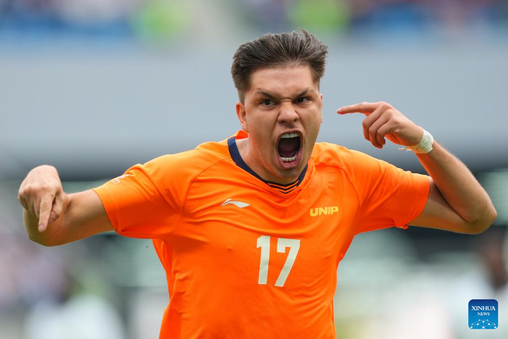 Gabriel Vieira Barbara of Paulista University celebrates his goal during the men's final match between Paulista University (Brazil) and University for Development Studies (Ghana) of 2025 FISU University World Cup Football in Dalian, northeast China's Liaoning Province, Sept. 28, 2025. (Xinhua/Zheng Huansong)