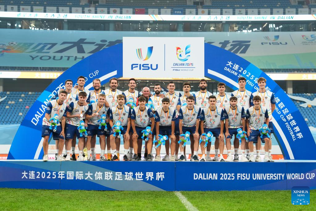 Bronze winner Team of University of Granada from Spain pose during the awarding ceremony of 2025 FISU University World Cup Football in Dalian, northeast China's Liaoning Province, Sept. 28, 2025. (Xinhua/Zheng Huansong)
