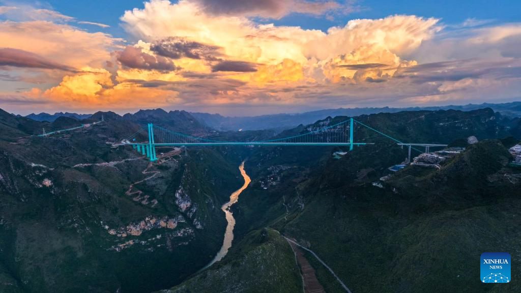 An aerial drone photo taken on Sept. 27, 2025 shows the Huajiang Grand Canyon Bridge at sunset in southwest China's Guizhou Province.(Xinhua/Ou Dongqu)