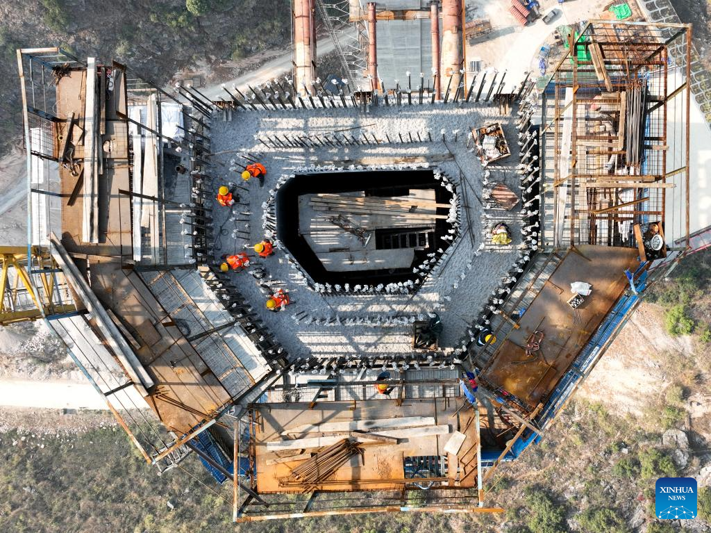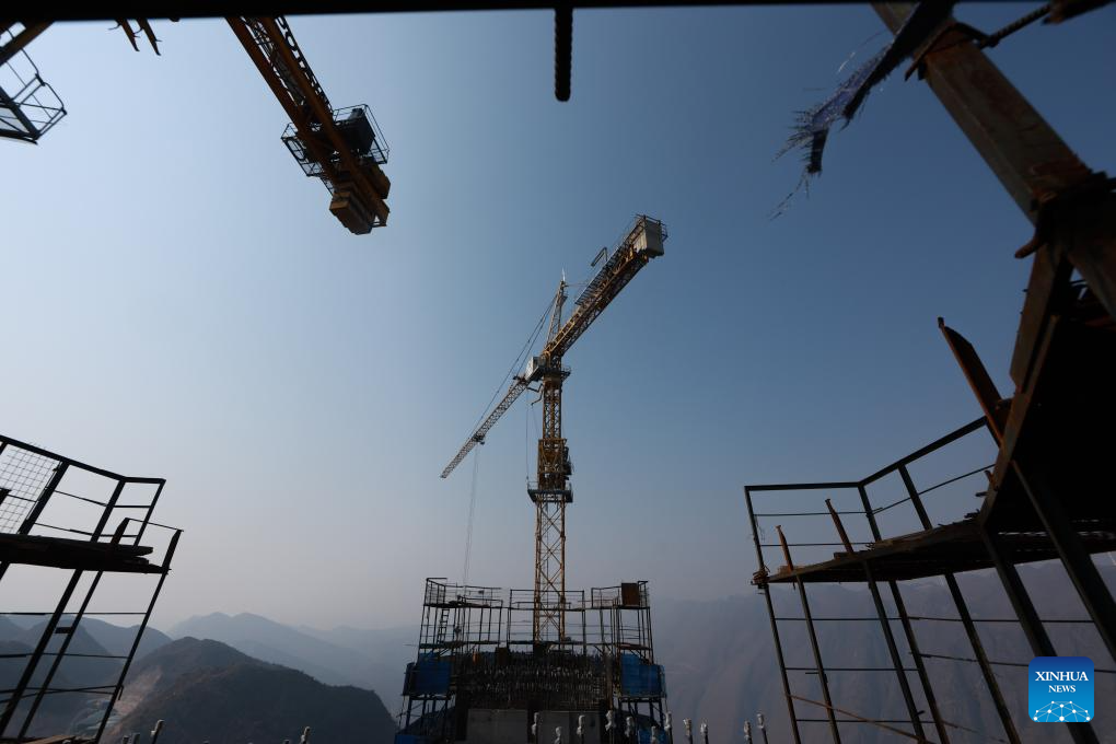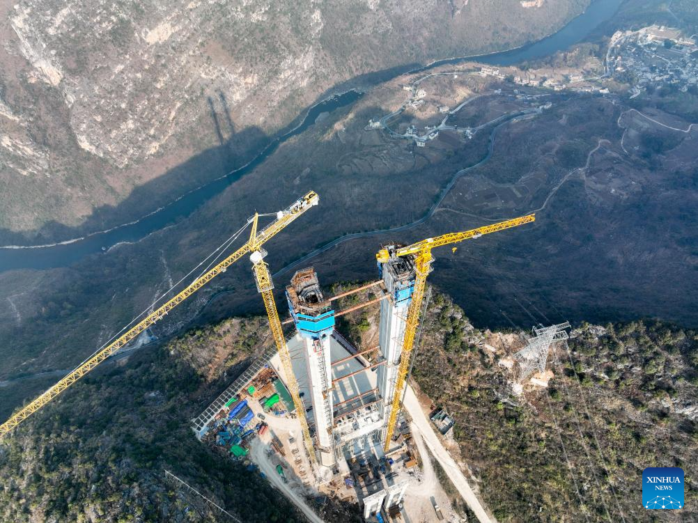 An aerial drone photo taken on Feb. 1, 2023 shows the construction site of the main bridge tower of the Huajiang Grand Canyon Bridge in southwest China's Guizhou Province.(Xinhua/Ou Dongqu)