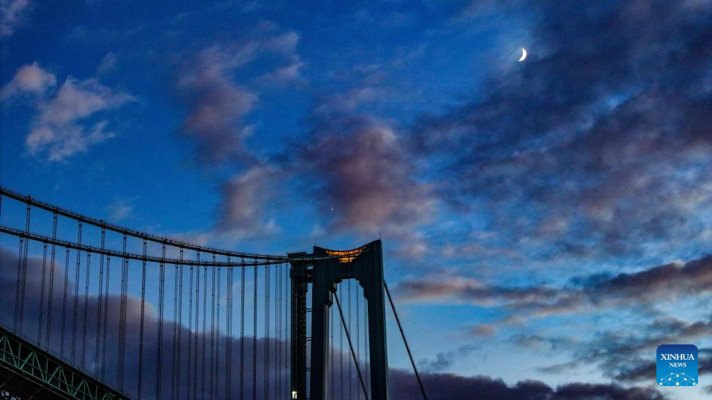 A drone photo taken on Sept. 28, 2025 shows a view of the Huajiang Grand Canyon Bridge against the setting sun in southwest China's Guizhou Province. (Xinhua/Yang Wenbin)