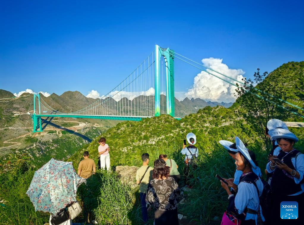 This photo taken with a mobile phone on Sept. 28, 2025 shows tourists taking photos of the Huajiang Grand Canyon Bridge in southwest China's Guizhou Province. (Xinhua/Yang Wenbin)