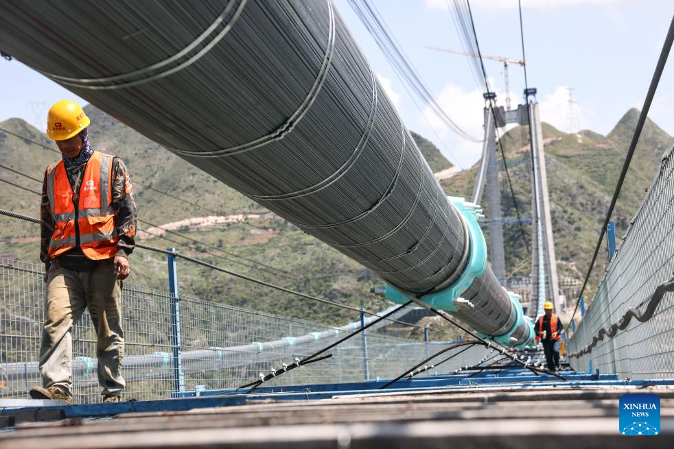Constructors work on a catwalk at the construction site of Huajiang Grand Canyon Bridge in southwest China's Guizhou Province, Sept. 4, 2024.(Xinhua/Ou Dongqu)