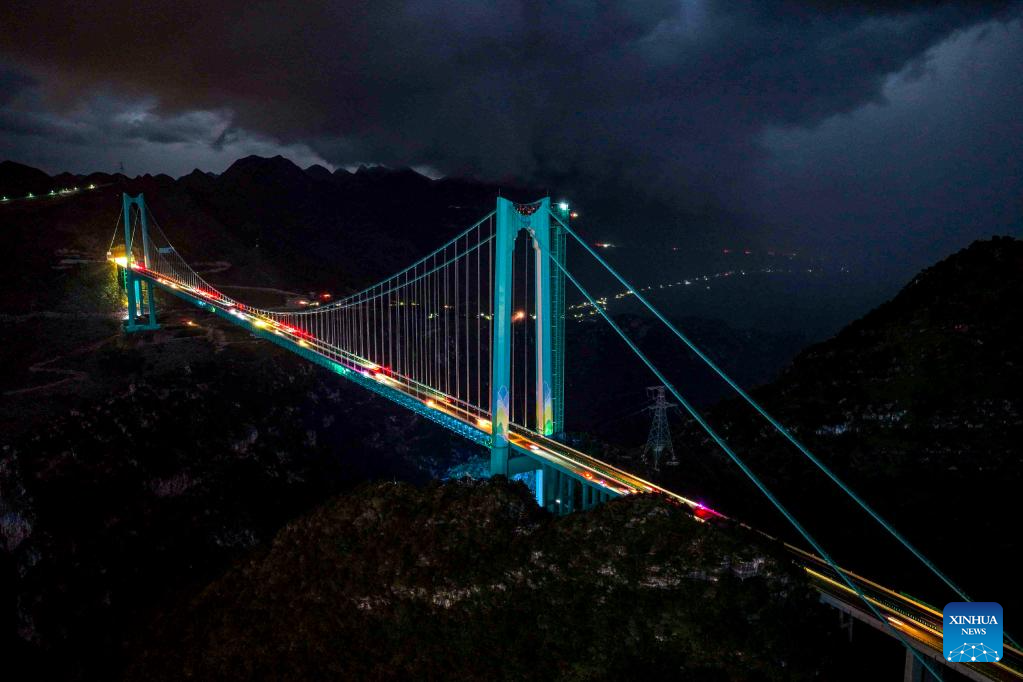 A drone photo taken on Sept. 27, 2025 shows a night view of the Huajiang Grand Canyon Bridge in southwest China's Guizhou Province. (Xinhua/Ou Dongqu)