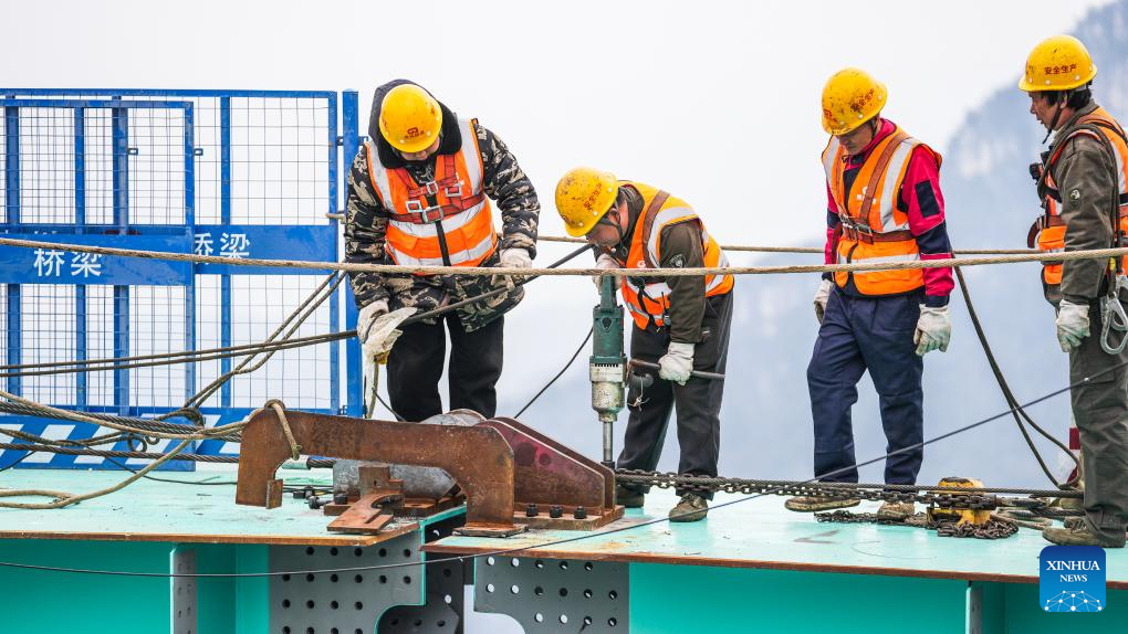 This photo shows workers working on the girder of the final section of the Huajiang Grand Canyon Bridge in southwest China's Guizhou Province, Jan. 14, 2025.(Xinhua/Yang Wenbin)