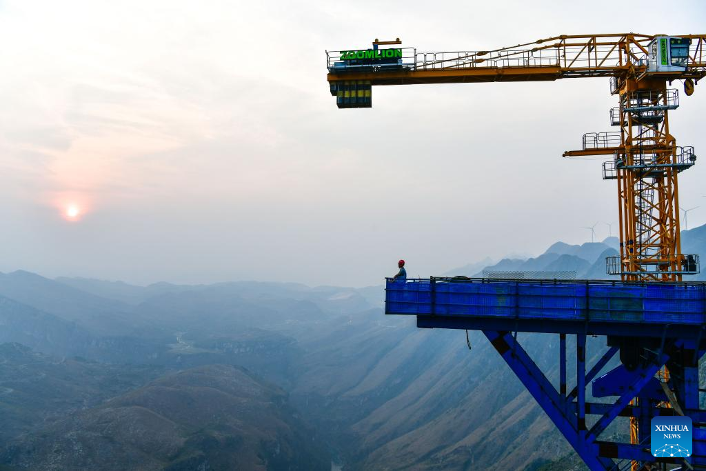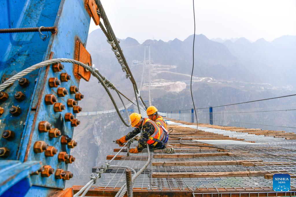 Constructors work at the construction site of the closure of the Huajiang Grand Canyon Bridge in southwest China's Guizhou Province, Jan. 17, 2025.(Xinhua/Tao Liang)