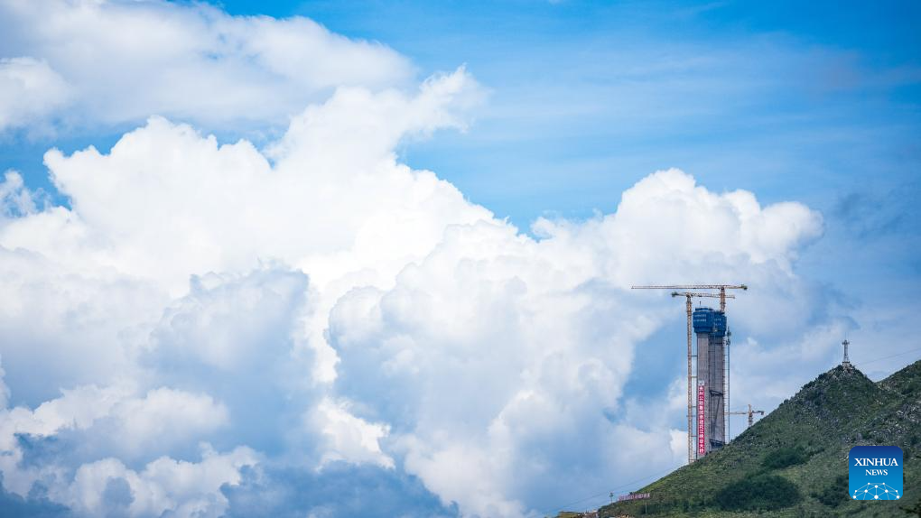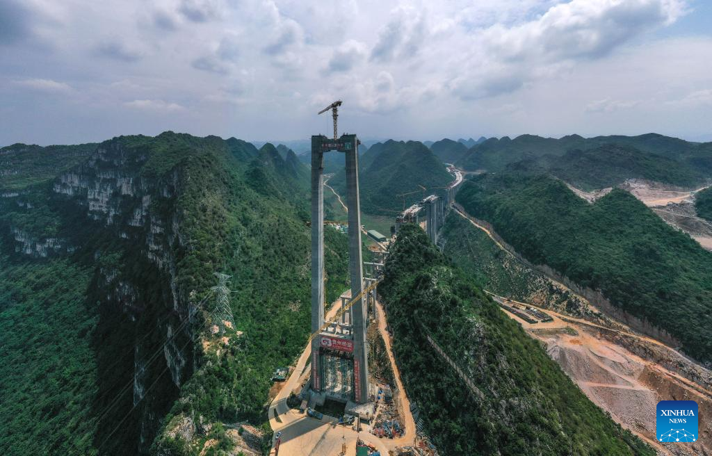 This photo taken on Aug. 3, 2023 show a main tower of the Huajiang Grand Canyon Bridge under construction in southwest China's Guizhou Province.(Xinhua/Tao Liang)