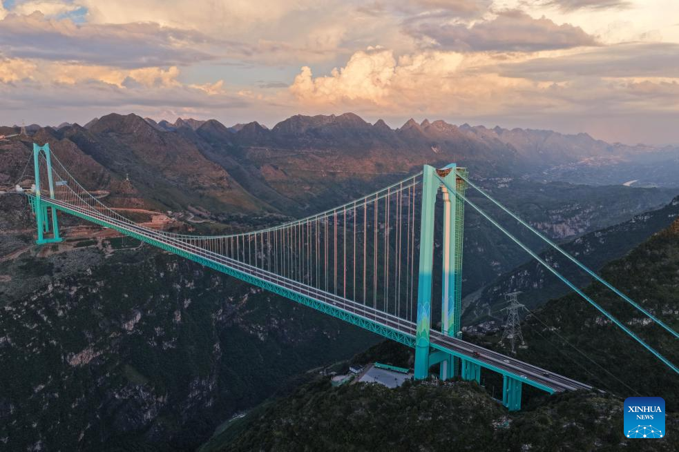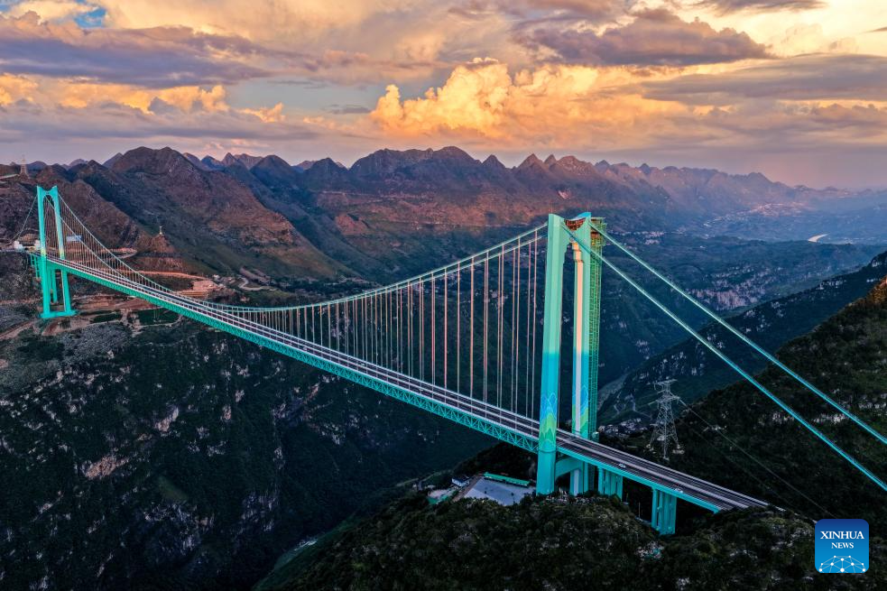 A drone photo taken on Sept. 28, 2025 shows a view of the Huajiang Grand Canyon Bridge against the setting sun in southwest China's Guizhou Province.(Xinhua/Yang Wenbin)