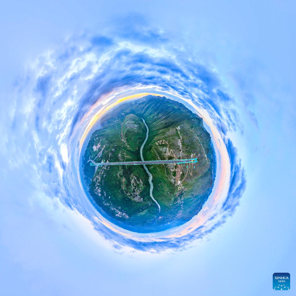 An aerial panoramic photo taken on Sept. 27, 2025 shows a view of the Huajiang Grand Canyon Bridge in southwest China's Guizhou Province. (Xinhua/Ou Dongqu)