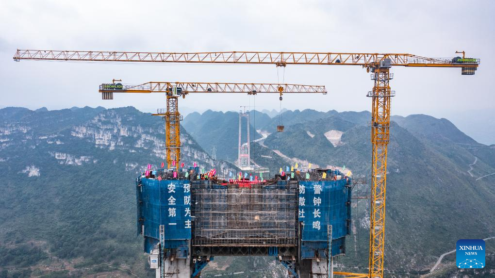 People work at the construction site of the Huajiang Grand Canyon Bridge in southwest China's Guizhou Province, March 27, 2024.(Xinhua/Yang Wenbin)