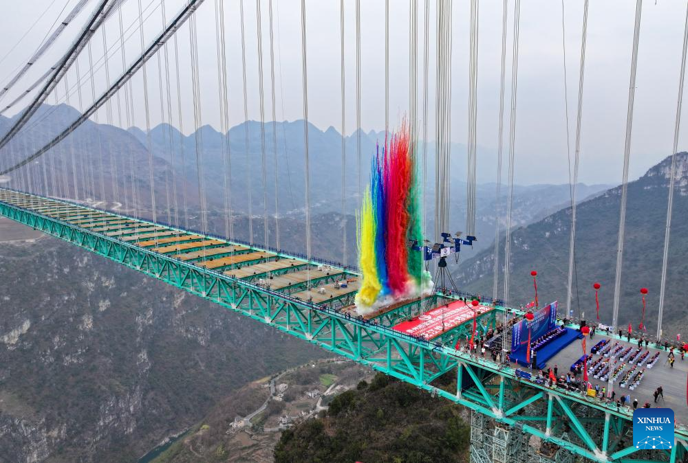An aerial drone photo taken on Jan. 17, 2025 shows a ceremony marking the completion of the main structure of the Huajiang Grand Canyon Bridge in southwest China's Guizhou Province.(Xinhua/Liu Xu)
