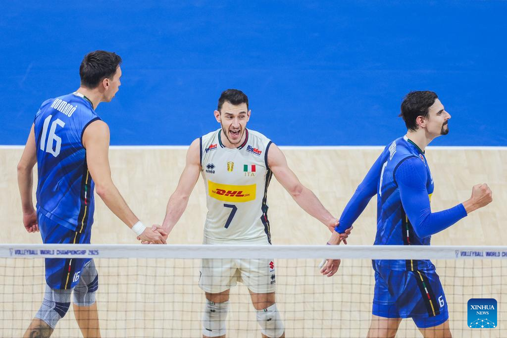 Players of Italy react after scoring during the final match between Italy and Bulgaria at the FIVB Men's World Championship 2025 in Pasay City, the Philippines, Sept. 28, 2025. (Xinhua/Rouelle Umali)