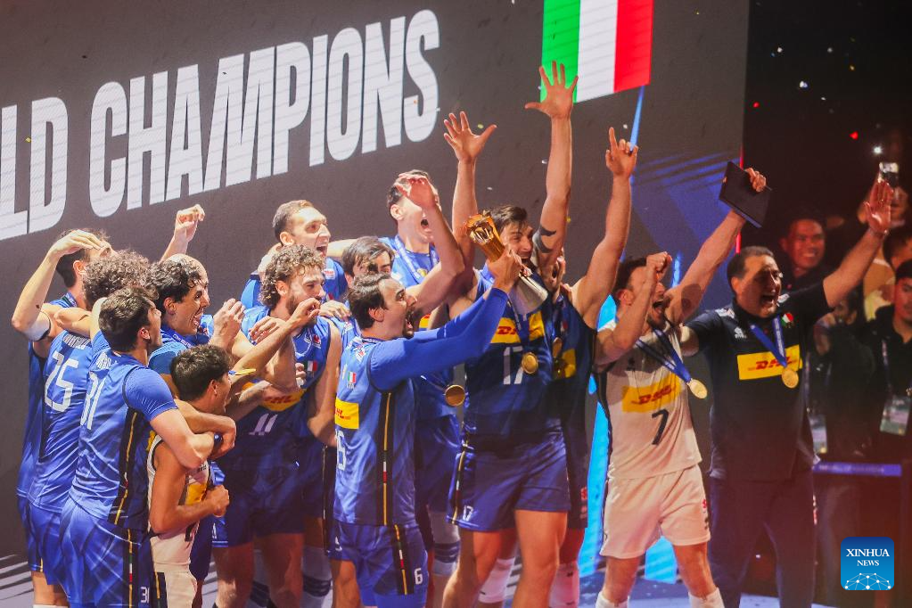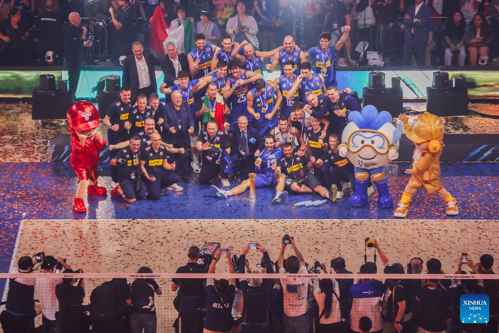 Players of Italy celebrate after winning the final match between Italy and Bulgaria at the FIVB Men's World Championship 2025 in Pasay City, the Philippines, Sept. 28, 2025. (Xinhua/Rouelle Umali)