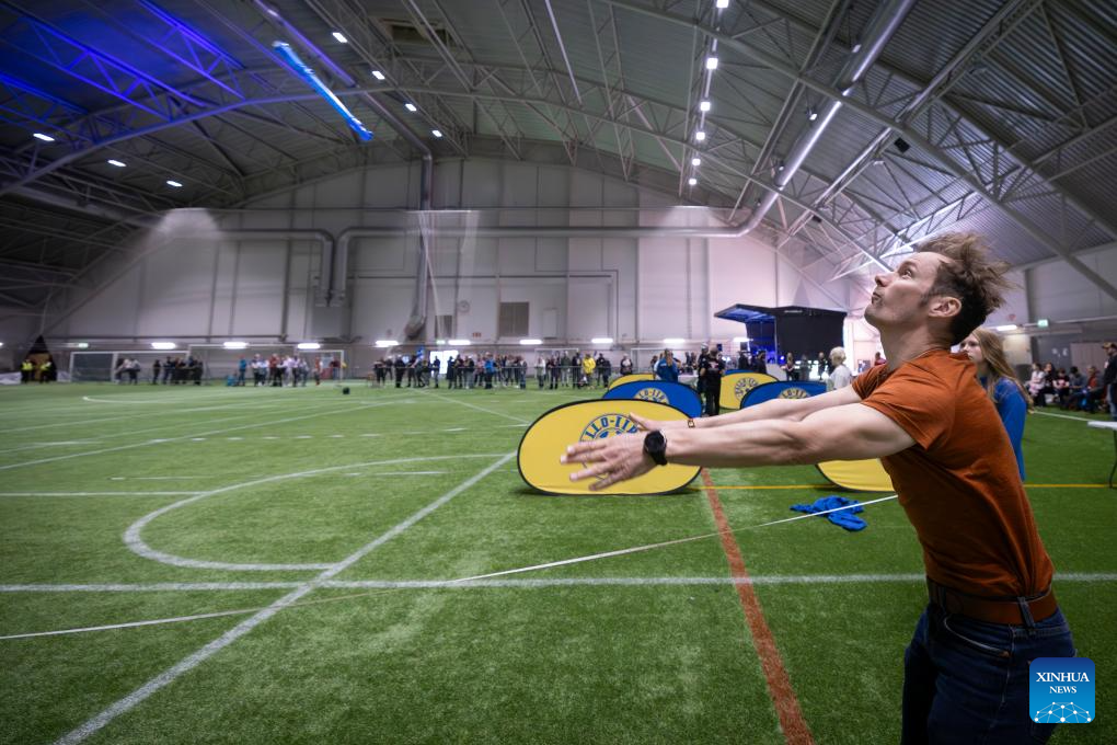A contestant prepares to throw a recorder during a recorder throwing championship in Rauma, a city in southwestern Finland, Sept. 28, 2025. The event, with the participation of nearly 100 contestants from across Finland, aims to encourage people to enjoy both sport and music and to spark everyday creativity. (Photo by Matti Matikainen/Xinhua)