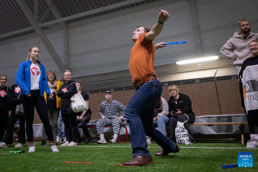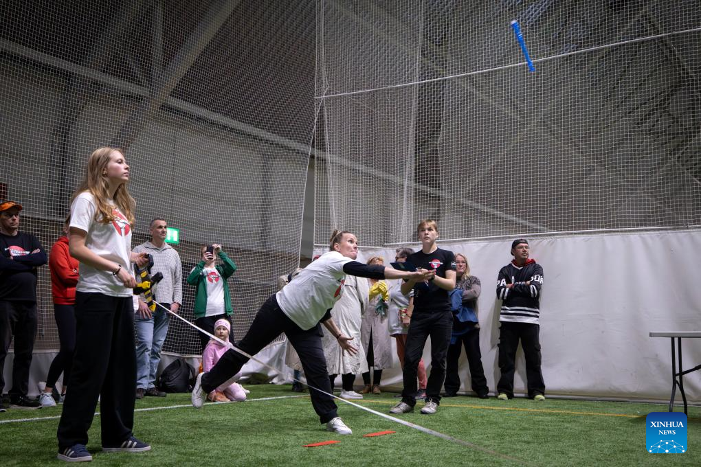 A contestant throws a recorder during a recorder throwing championship in Rauma, a city in southwestern Finland, Sept. 28, 2025. The event, with the participation of nearly 100 contestants from across Finland, aims to encourage people to enjoy both sport and music and to spark everyday creativity. (Photo by Matti Matikainen/Xinhua)