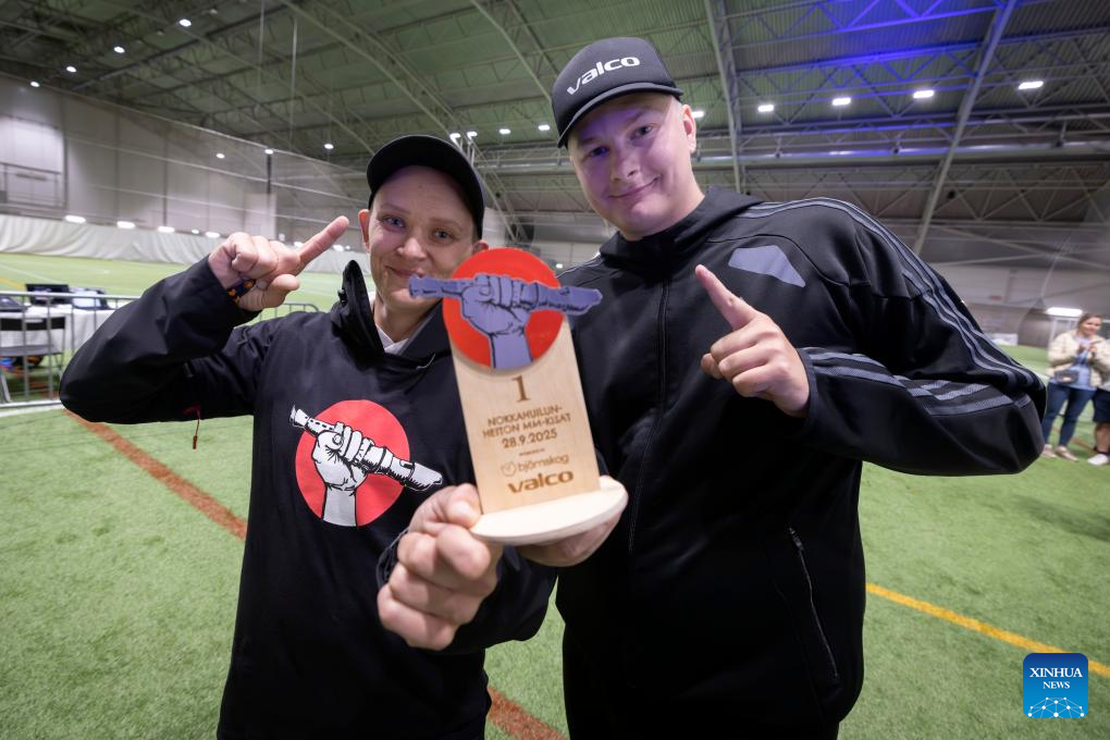 Contestants display their trophy during a recorder throwing championship in Rauma, a city in southwestern Finland, Sept. 28, 2025. The event, with the participation of nearly 100 contestants from across Finland, aims to encourage people to enjoy both sport and music and to spark everyday creativity. (Photo by Matti Matikainen/Xinhua)