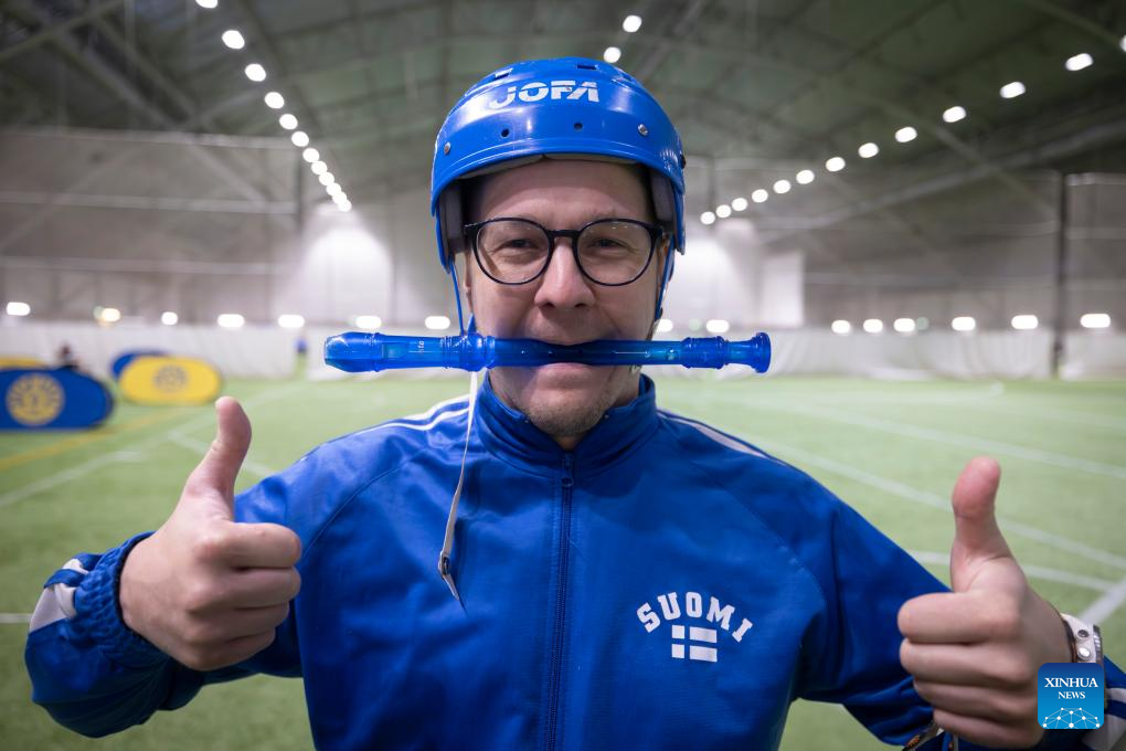 A contestant poses for a photo during a recorder throwing championship in Rauma, a city in southwestern Finland, Sept. 28, 2025. The event, with the participation of nearly 100 contestants from across Finland, aims to encourage people to enjoy both sport and music and to spark everyday creativity. (Photo by Matti Matikainen/Xinhua)
