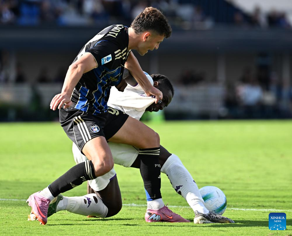 Fiorentina's Jacopo Fazzini (L) vies with Pisa's Antonio Caracciolo during a Serie A soccer match between Pisa and Fiorentina in Pisa, Italy, Sept.28, 2025. (Xinhua)