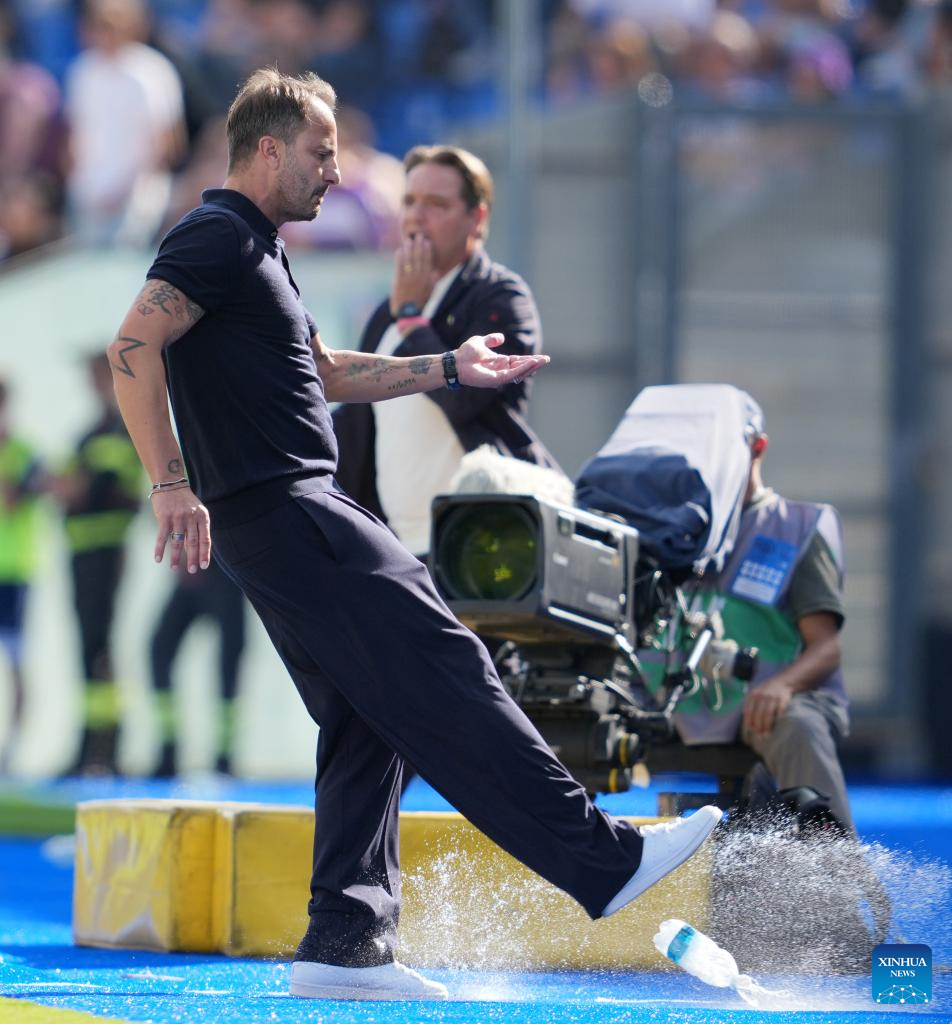 Pisa's head coach Alberto Gilardino reacts during a Serie A soccer match between Pisa and Fiorentina in Pisa, Italy, Sept.28, 2025. (Xinhua)