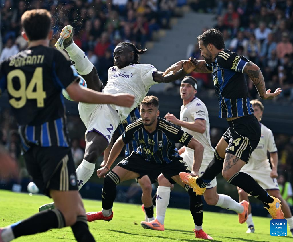 Fiorentina's Moise Kean (C) vies with Pisa's Antonio Caracciolo during a Serie A soccer match between Pisa and Fiorentina in Pisa, Italy, Sept.28, 2025. (Xinhua)