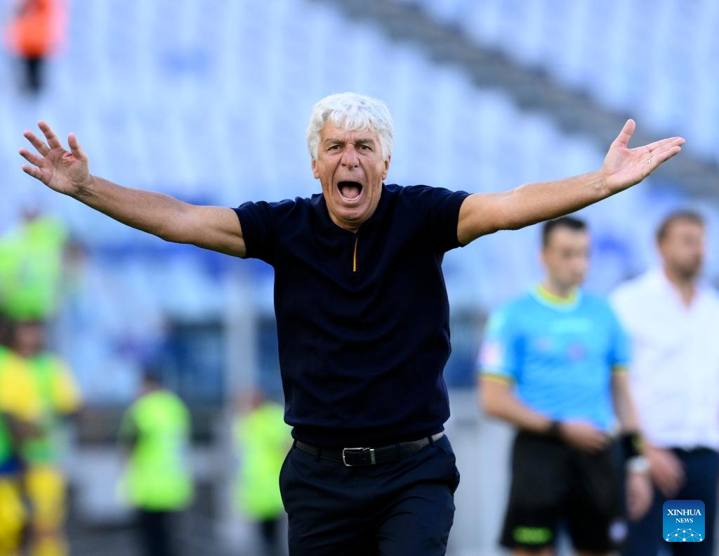 Roma's head coach Giampiero Gasperini reacts during a Serie A soccer match between Roma and Hellas Verona in Rome, Italy, Sept. 28, 2025. (Photo by Augusto Casasoli/Xinhua)