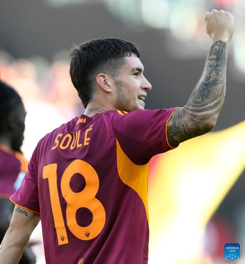 Roma's Matias Soule celebrates his goal during a Serie A soccer match between Roma and Hellas Verona in Rome, Italy, Sept. 28, 2025. (Photo by Augusto Casasoli/Xinhua)