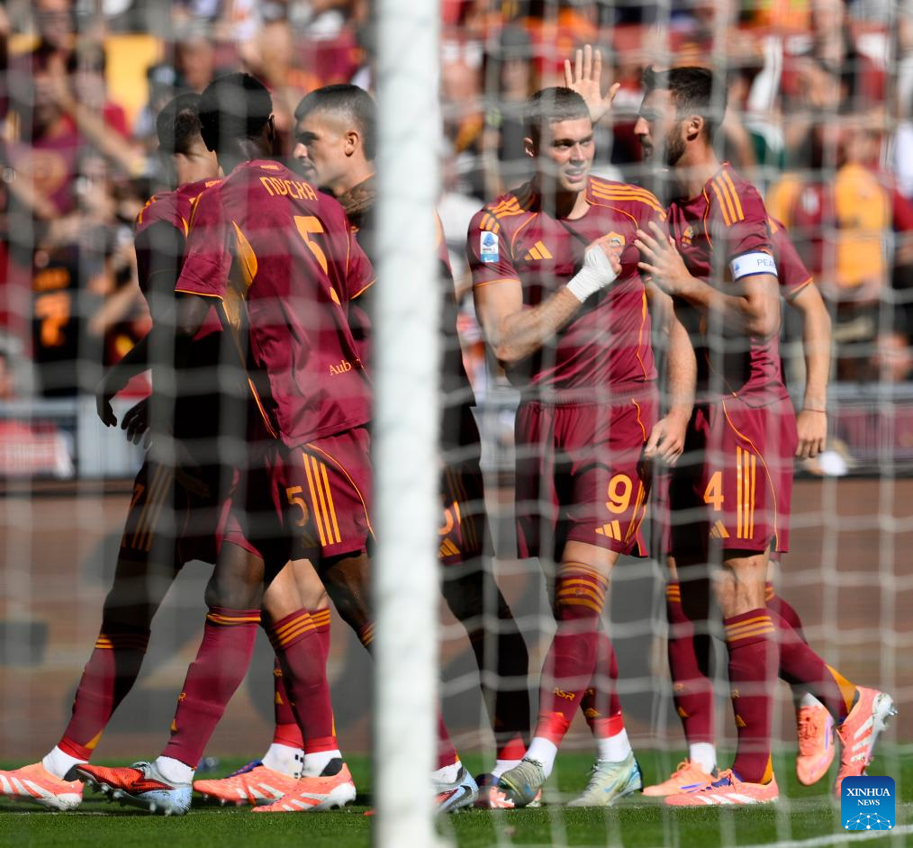 Roma's Artem Dovbyk (2nd R) celebrates his goal with his teammates during a Serie A soccer match between Roma and Hellas Verona in Rome, Italy, Sept. 28, 2025. (Photo by Augusto Casasoli/Xinhua)