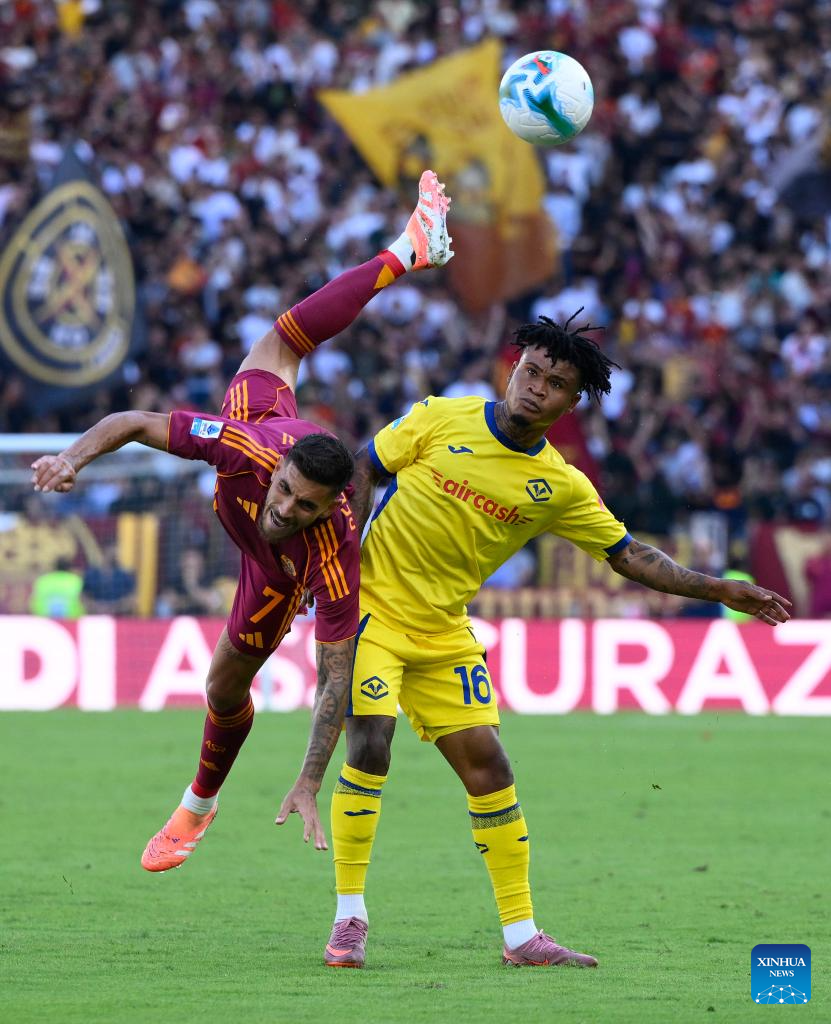 Roma's Lorenzo Pellegrini (L) vies with Hellas Verona's Emmanuel Orban during a Serie A soccer match between Roma and Hellas Verona in Rome, Italy, Sept. 28, 2025. (Photo by Augusto Casasoli/Xinhua)