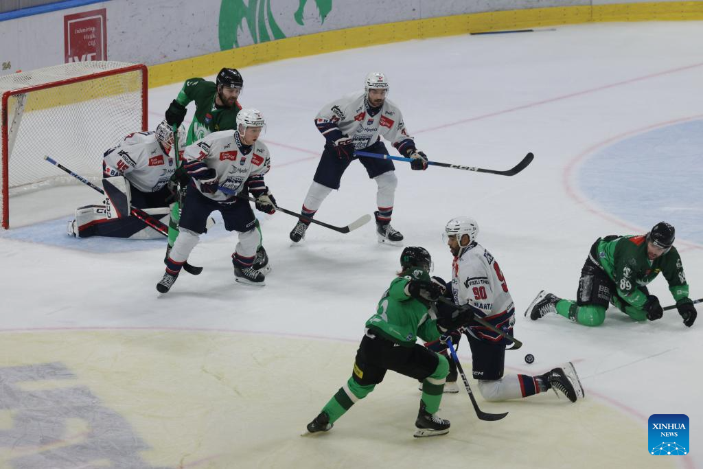 Lukas Horak (1st R) of HK Olimpija saves the goal during the 2025/26 Win2day Ice Hockey League between HK Olimpija and Hydro Fehervar AV 19 in Ljubljana, Slovenia, Sept. 28, 2025. (Photo by Zeljko Stevanic/Xinhua)