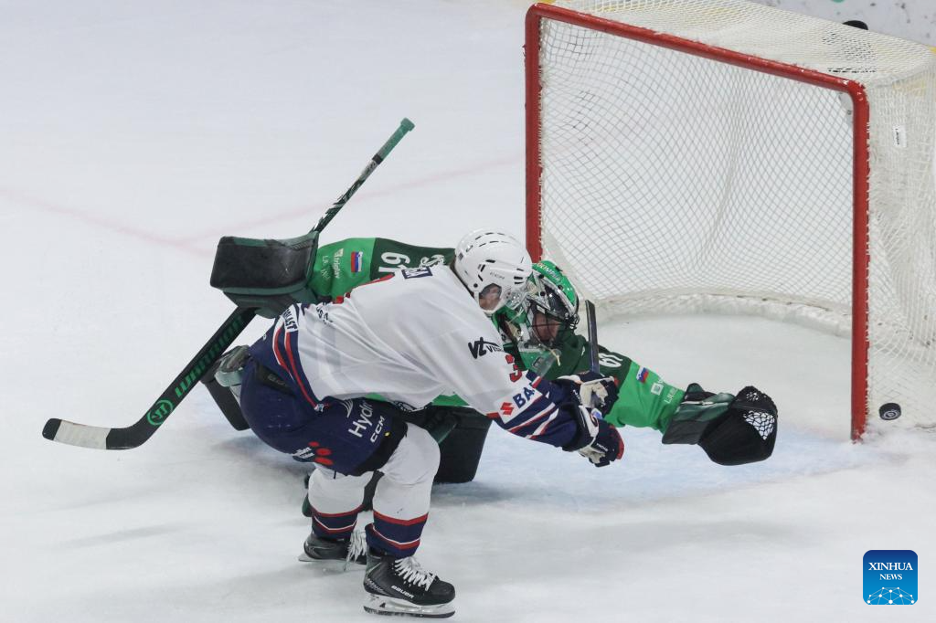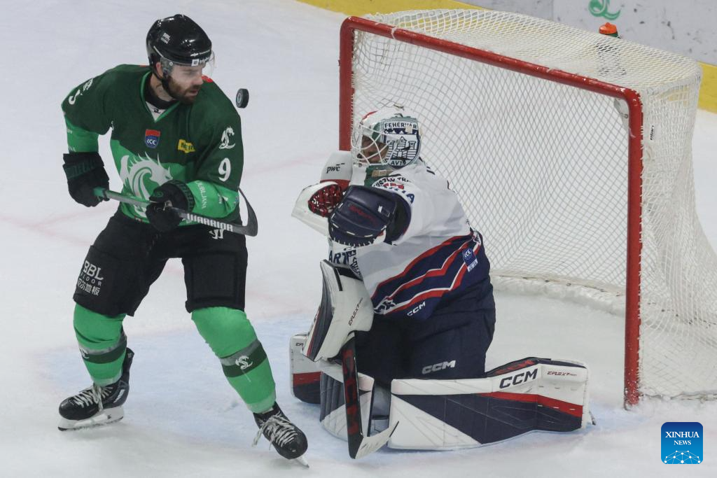 Zach Boychuk (L) of HK Olimpija scores the winning penalty shot during the 2025/26 Win2day Ice Hockey League between HK Olimpija and Hydro Fehervar AV 19 in Ljubljana, Slovenia, Sept. 28, 2025. (Photo by Zeljko Stevanic/Xinhua)