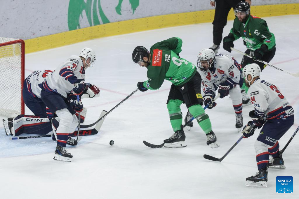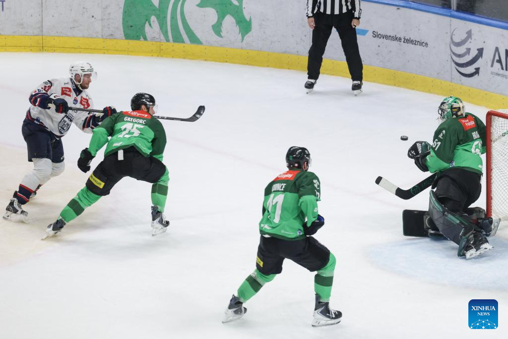 Evan Polei (3rd L) of HK Olimpija competes during the 2025/26 Win2day Ice Hockey League between HK Olimpija and Hydro Fehervar AV 19 in Ljubljana, Slovenia, Sept. 28, 2025. (Photo by Zeljko Stevanic/Xinhua)