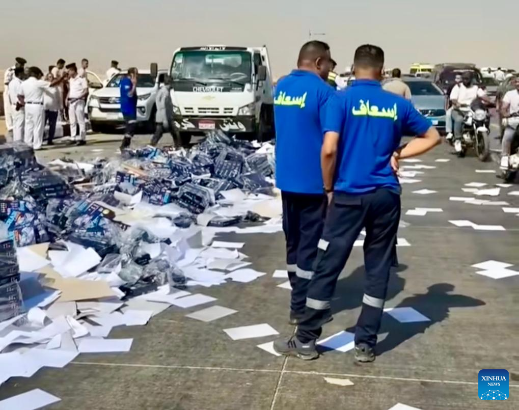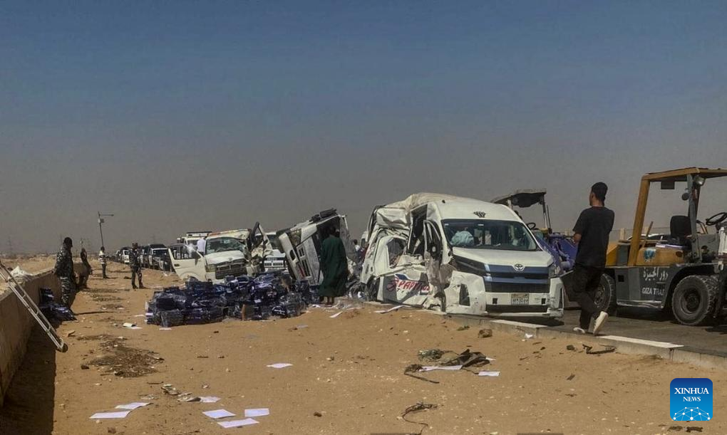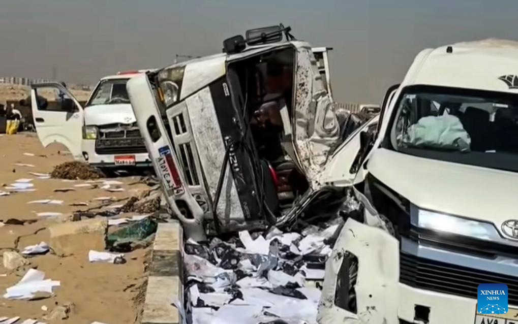 Photo taken on Sept. 29, 2025 shows the accident site in Giza, Egypt. Two Chinese were killed on Monday when a microbus collided with private cars near the Giza pyramid complex in Greater Cairo, according to the Chinese Embassy in Egypt. (Xinhua)