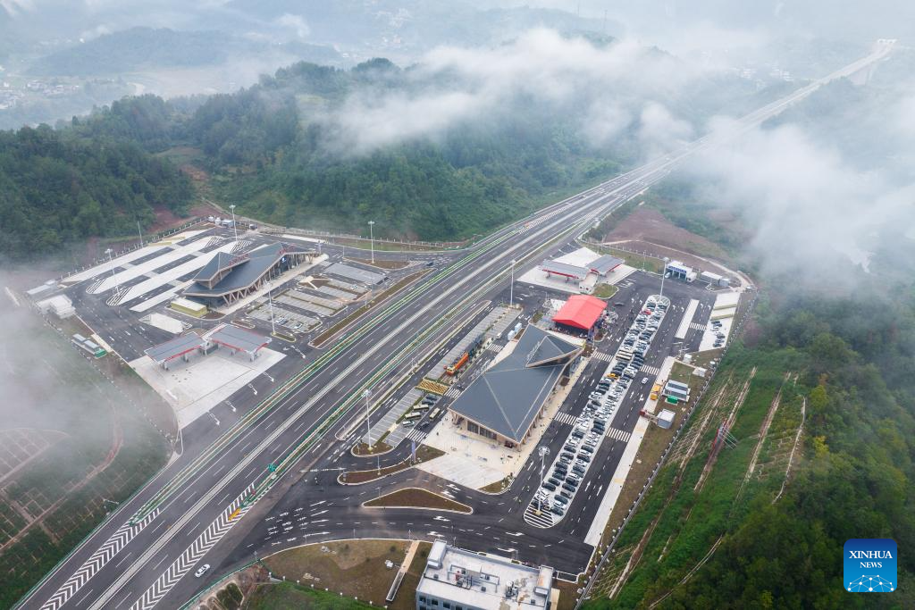An aerial drone photo taken on Sept. 29, 2025 shows a service area along the Sangzhi-Longshan expressway in Sangzhi County, central China's Hunan Province. The Sangzhi-Longshan expressway opened to traffic on Monday. With a length of about 61.5 kilometers, the expressway connects Sangzhi County in Zhangjiajie and Longshan County in Xiangxi Tujia and Miao Autonomous Prefecture in central China's Hunan Province. (Xinhua/Chen Sihan)