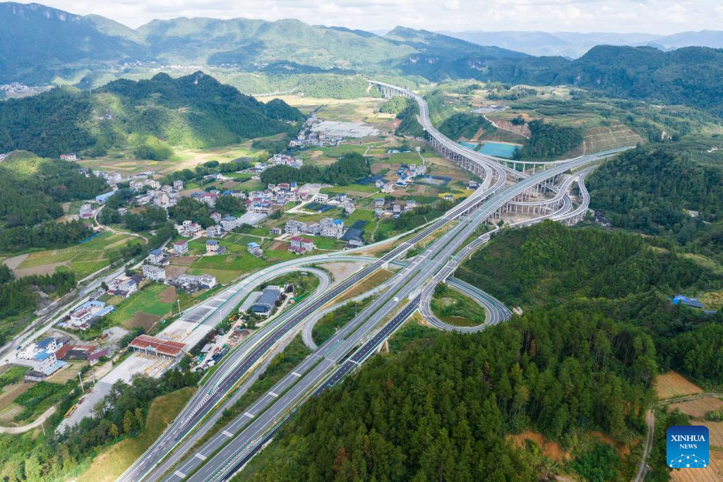 An aerial drone photo taken on Sept. 29, 2025 shows a transportation hub of the Sangzhi-Longshan expressway in Longshan County, central China's Hunan Province. The Sangzhi-Longshan expressway opened to traffic on Monday. With a length of about 61.5 kilometers, the expressway connects Sangzhi County in Zhangjiajie and Longshan County in Xiangxi Tujia and Miao Autonomous Prefecture in central China's Hunan Province. (Xinhua/Chen Sihan)