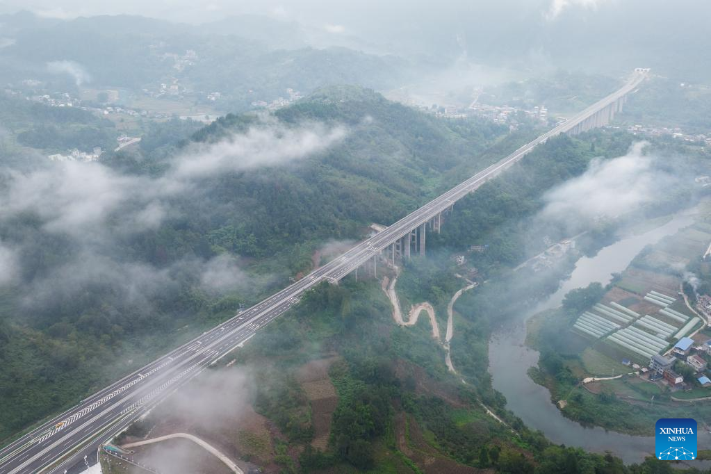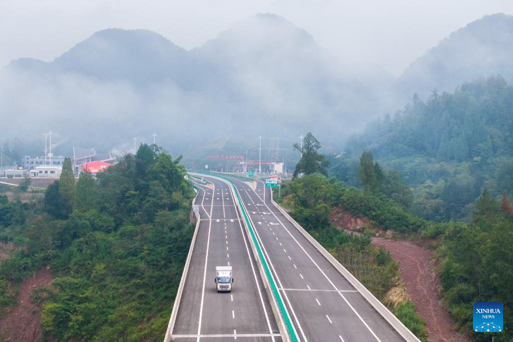 An aerial drone photo taken on Sept. 29, 2025 shows the Sangzhi-Longshan expressway in central China's Hunan Province. The Sangzhi-Longshan expressway opened to traffic on Monday. With a length of about 61.5 kilometers, the expressway connects Sangzhi County in Zhangjiajie and Longshan County in Xiangxi Tujia and Miao Autonomous Prefecture in central China's Hunan Province. (Xinhua/Chen Sihan)