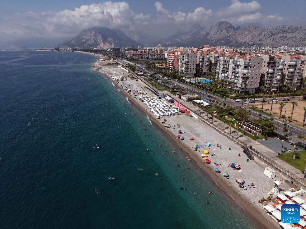 An aerial drone photo taken on Sept. 28, 2025 shows people enjoying leisure time on the beach of Konyaalti in Antalya, Türkiye. As a Türkiye's Mediterranean resort city, Antalya is famous for its endless turquoise waters and natural beauties. (Mustafa Kaya/Handout via Xinhua)