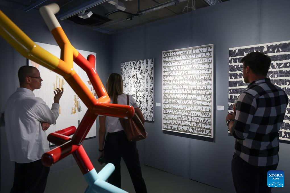 Visitors watch artworks on display at the Budapest Contemporary exhibition in Budapest, Hungary on Sept. 28, 2025. Budapest Contemporary exhibition kicked off in Budapest on Sunday. (Photo by Attila Volgyi/Xinhua)