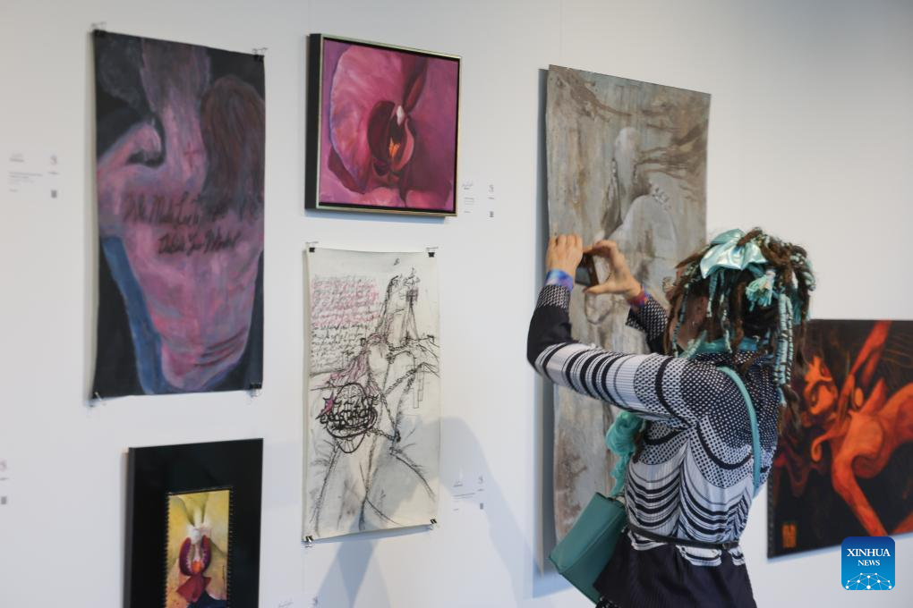 A visitor takes photos of artworks on display at the Budapest Contemporary exhibition in Budapest, Hungary on Sept. 28, 2025. Budapest Contemporary exhibition kicked off in Budapest on Sunday. (Photo by Attila Volgyi/Xinhua)