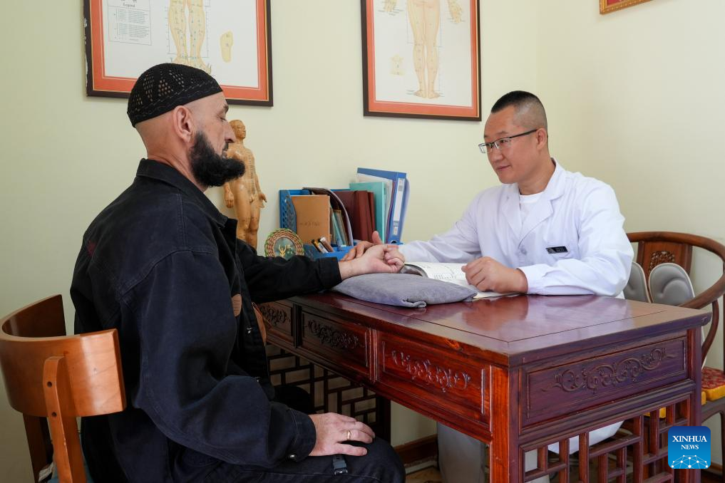A doctor takes the pulse of a Russian patient at a hospital in Hunchun, northeast China's Jilin Province, Sept. 29, 2025. In several traditional Chinese medicine hospitals across northeast China, the number of Russian patients seeking treatment and rehabilitation continues to grow. Traditional Chinese medicine, with its unique diagnostic and therapeutic methods, is increasingly favored by Russian patients.
