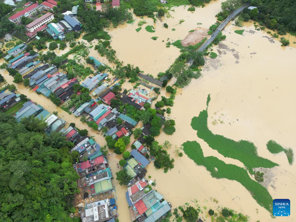 A drone photo taken on Sept. 30, 2025 shows houses partially submerged in flood water in Lao Cai Province, Vietnam. The death toll from Typhoon Bualoi and subsequent floods and landslides in Vietnam has risen to 27, with 21 people still missing and 112 others injured across 17 northern and central provinces, Vietnam News Agency reported Tuesday. (VNA via Xinhua)