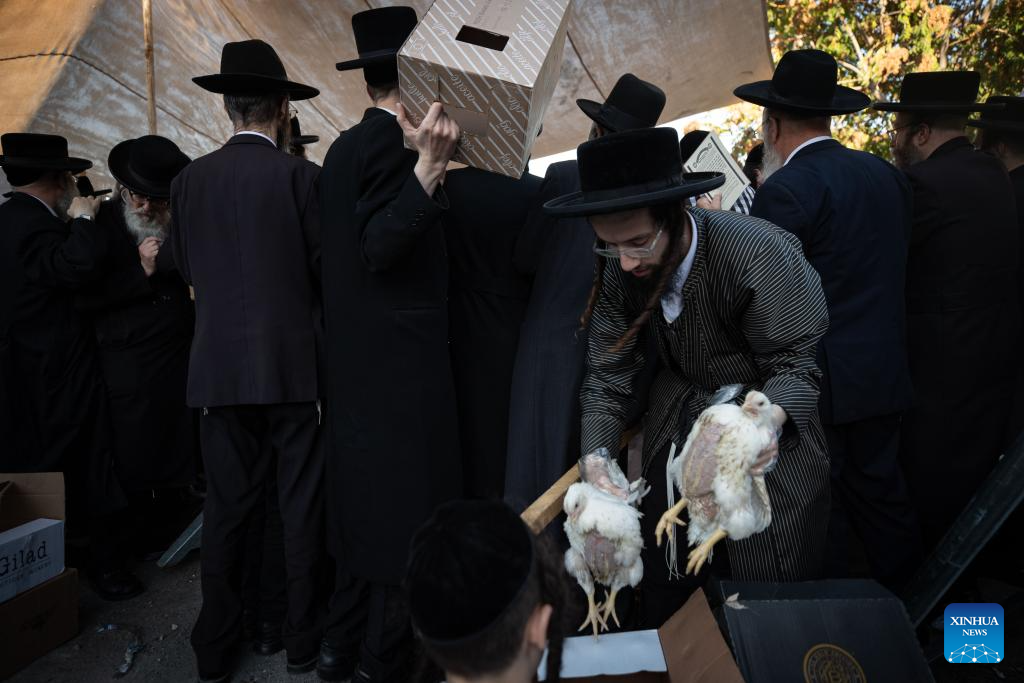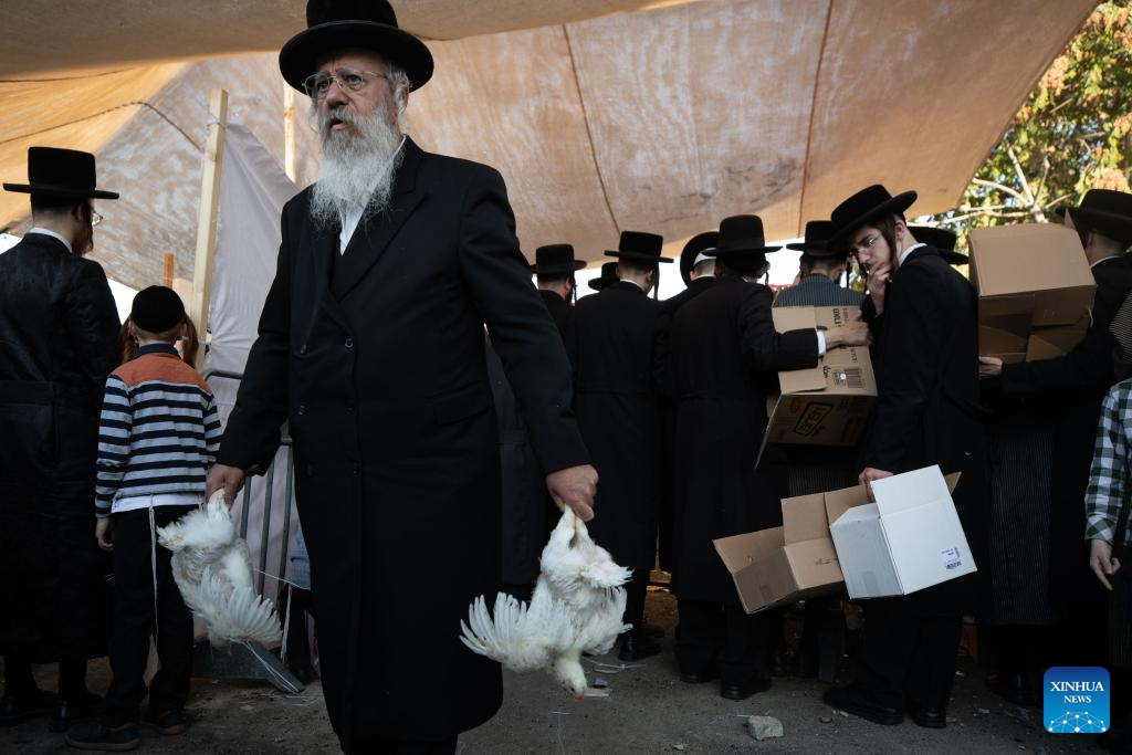 Ultra-Orthodox Jews perform the Kaparot ritual, where white chickens are slaughtered as a symbolic gesture of atonement ahead of Yom Kippur, the Jewish Day of Atonement, in the neighborhood of Mea Shearim in Jerusalem, on Sept. 29, 2025. (Xinhua/Chen Junqing)