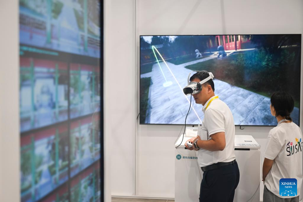 A visitor takes part in VR experience during an exhibition of Shanghai Urban Space Art Season 2025 in Shanghai, east China, on Sept. 30, 2025. Sci-tech design exhibition, art show, drone performance and light show are scheduled to be held during the event. (Xinhua/Chen Haoming)