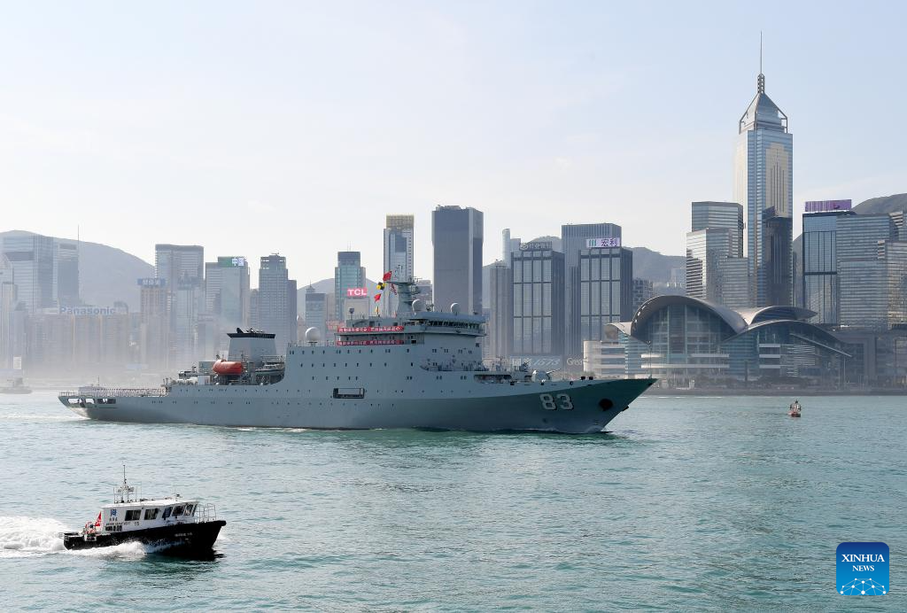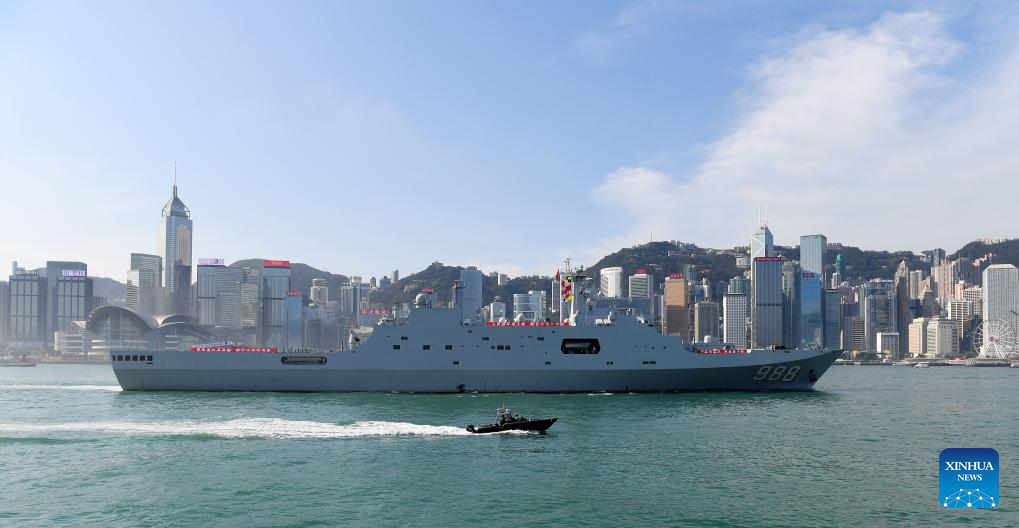 Escorted by vessels from the PLA Hong Kong Garrison and the HKSAR government, Qi Jiguang and Yimengshan sailed towards the PLA Hong Kong Garrison's naval base in Stonecutters Island. The two vessels will be open for public visits at the Stonecutters Island Navel Base. (Xinhua/Chen Duo)