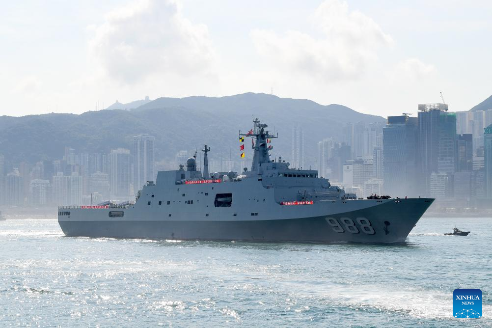 Chinese People's Liberation Army (PLA) Navy ship Qi Jiguang passes by Victoria Harbor in Hong Kong, south China, on Sept. 30, 2025. PLA Navy ships Qi Jiguang and Yimengshan entered the waters of the Hong Kong Special Administrative Region (HKSAR) on Tuesday morning.