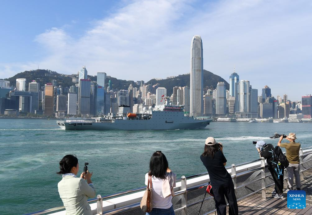 Chinese People's Liberation Army (PLA) Navy ship Yimengshan passes by Victoria Harbor in Hong Kong, south China, on Sept. 30, 2025. PLA Navy ships Qi Jiguang and Yimengshan entered the waters of the Hong Kong Special Administrative Region (HKSAR) on Tuesday morning.