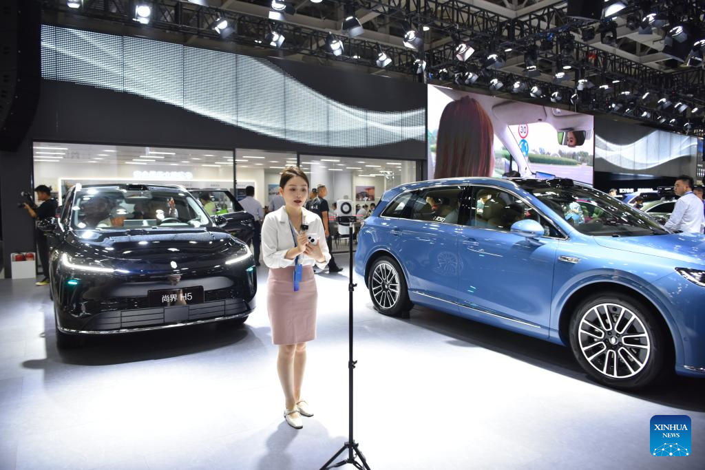 A staff member promotes a car via live-streaming at an automobile consumption promotion event held in Changsha, central China's Hunan Province, Oct. 1, 2025. The event kicked off at Hunan International Convention and Exhibition Center on Wednesday with an aim to activate the vitality of the automotive consumption market. (Xinhua/Ding Chunyu)