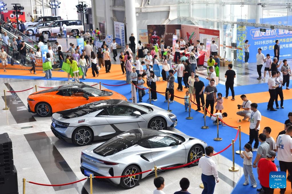 Visitors view cars displayed at an automobile consumption promotion event held in Changsha, central China's Hunan Province, Oct. 1, 2025. The event kicked off at Hunan International Convention and Exhibition Center on Wednesday with an aim to activate the vitality of the automotive consumption market. (Xinhua/Ding Chunyu)
